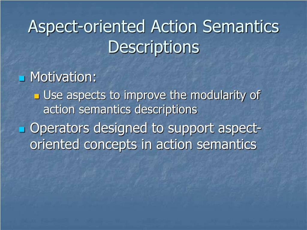 Aspect-oriented Action SemanticsDescriptions • Motivation: • Use aspects to improve the modularity of action semantics descriptions • Operators designed to support aspect-oriented concepts in action semantics