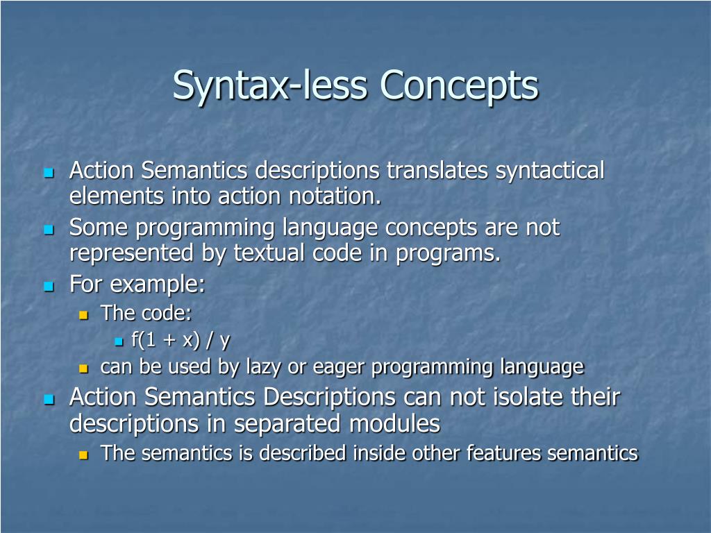 Syntax-less Concepts • Action Semantics descriptions translates syntactical elements into action notation. • Some programming language concepts are not represented by textual code in programs. • For example: • The code: • f(1 + x) / y • can be used by lazy or eager programming language • Action Semantics Descriptions can not isolate their descriptions in separated modules • The semantics is described inside other features semantics