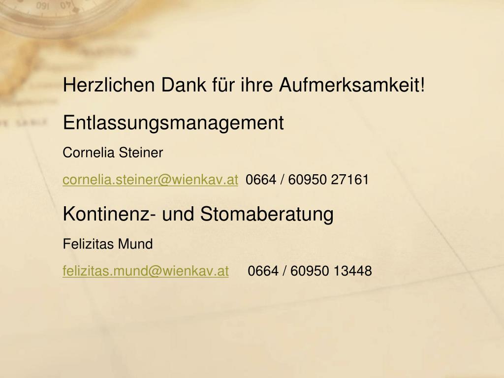 Herzlichen Dank für ihre Aufmerksamkeit! Entlassungsmanagement Cornelia Steiner cornelia.steiner@wienkav.at 0664 / 60950 27161 Kontinenz- und Stomaberatung Felizitas Mund felizitas.mund@wienkav.at 0664 / 60950 13448