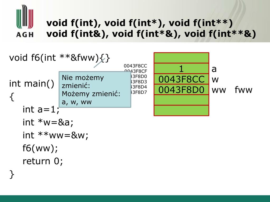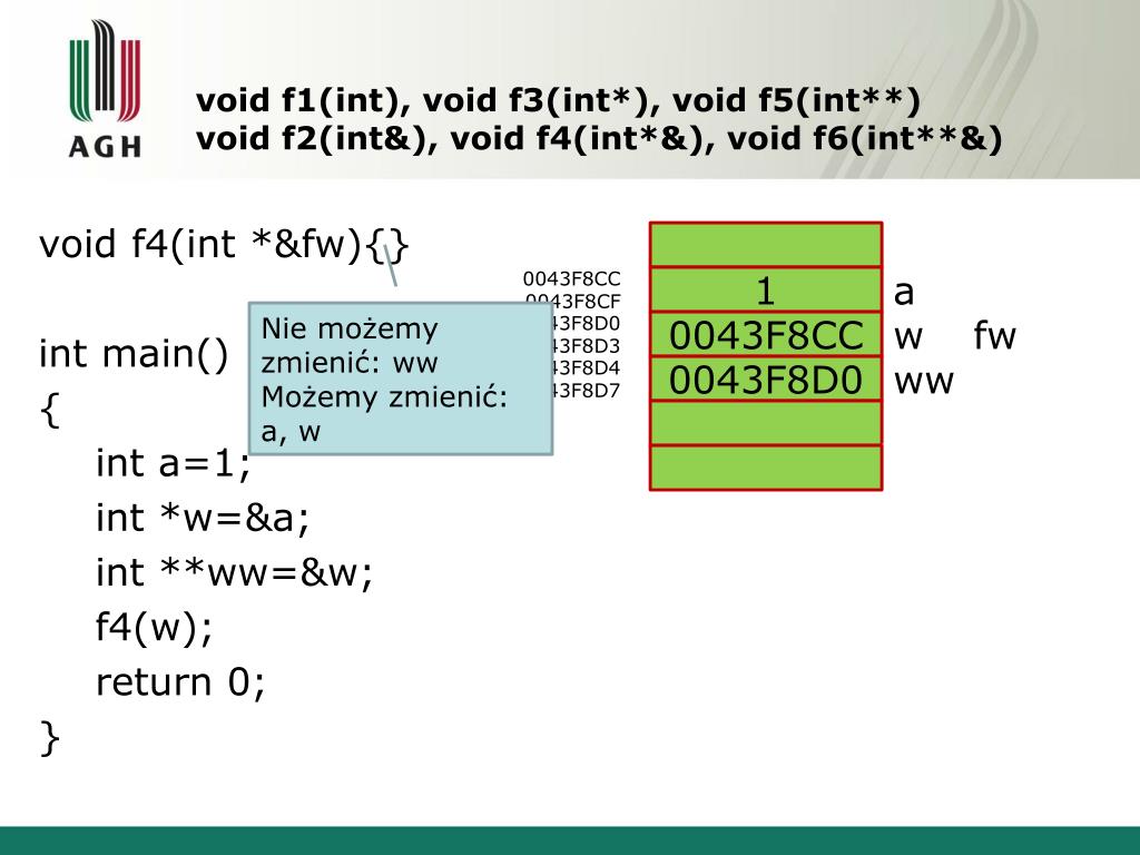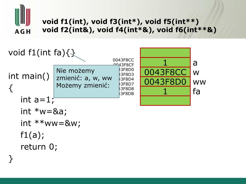 void f1(int), void f3(int*), void f5(int**)void f2(int&), void f4(int*&), void f6(int**&) void f1(intfa){} intmain() { int a=1; int *w=&a; int **ww=&w; f1(a); return 0; } 0043F8CC 0043F8CF 1 a Nie możemy zmienić: a, w, ww Możemy zmienić: 0043F8D0 0043F8D3 0043F8CC w 0043F8D4 0043F8D7 0043F8D0 ww 0043F8D8 0043F8DB 1 fa