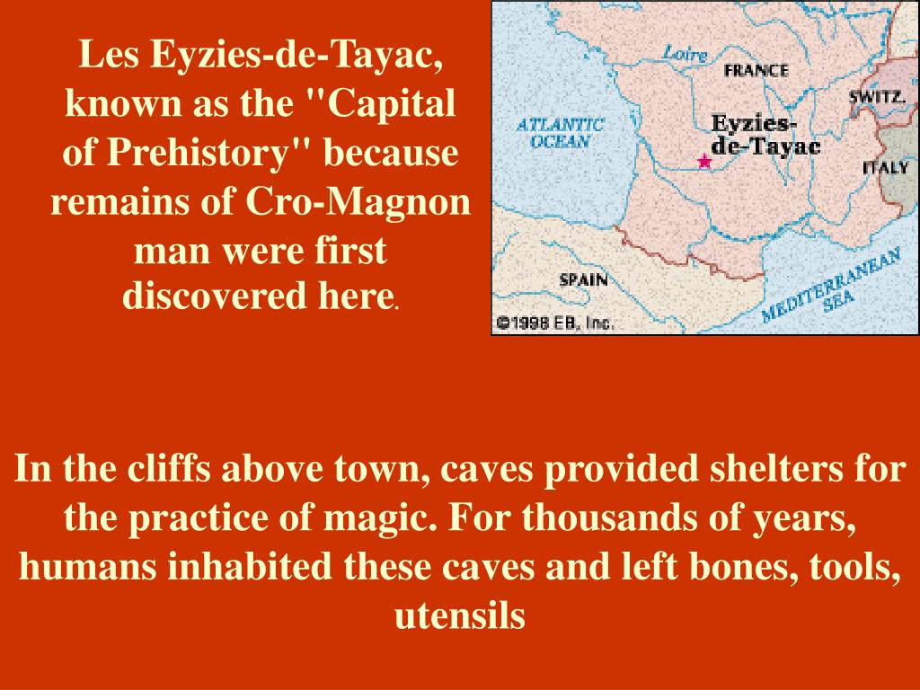 Modern Humans:HOMO SAPIENS SAPIENS • First fossil remains of homo sapiens sapiens -- named Cro-magnon--found in 1868 in a 28,000 year old rock shelter in Les Eyzies-de-Tayac, France • Homo sapiens sapiens very likely evolved from archaic homo sapiens in Africa and/or the Near East • Earliest remains dated to 120,000-100,000 years ago in Near East and South Africa • Began to appear in Europe and East Asia. 50,000-40,000 years ago