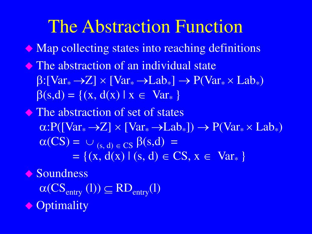 The Abstraction Function • Map collecting states into reaching definitions • The abstraction of an individual state:[Var* Z] [Var* Lab*] P(Var* Lab*)(s,d) = {(x, d(x) | x Var* } • The abstraction of set of states:P([Var* Z] [Var* Lab*]) P(Var* Lab*) (CS) = (s, d) CS (s,d) = = {(x, d(x) | (s, d) CS, x Var* } • Soundness(CSentry (l)) RDentry(l) • Optimality