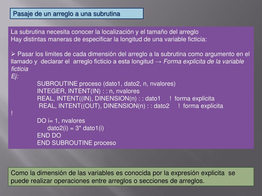 Ej: SUBROUTINE proceso2 (dato1, dato2, n, nvalores) INTEGER, INTENT(IN) : : n, nvalores REAL, INTENT((IN), DINENSION(n) : : dato1 ! forma explicita REAL, INTENT((OUT), DINENSION(n) : : dato2 ! forma explicita ! dato2(1:nvalores) = 3. * dato1(1: nvalores) END SUBROUTINE proceso2 Otra forma es el asumir el tamaño del arreglo ficticio a través de un *. En este como el compilador no conoce el tamaño del arreglo no puede efectuar operaciones entre arreglos o secciones de los mismos Ej: SUBROUTINE proceso3(dato1, dato2, n, nvalores) INTEGER, INTENT(IN) : : n, nvalores REAL, INTENT((IN), DINENSION(*) : : dato1 ! se asume el tamaño REAL, INTENT((OUT), DINENSION(*) : : dato2 ! se asume el tamaño ! DO i= 1, nvalores dato2(i) = 3* dato1(i) END DO END SUBROUTINE proceso3