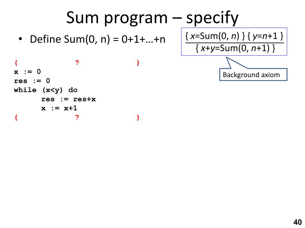 Sum program – specify { x=Sum(0, n) } { y=n+1 } { x+y=Sum(0, n+1) } { y0 }x := 0res := 0while (x<y) do res := res+x x := x+1 { res = Sum(0, y) } Background axiom Define Sum(0, n) = 0+1+…+n