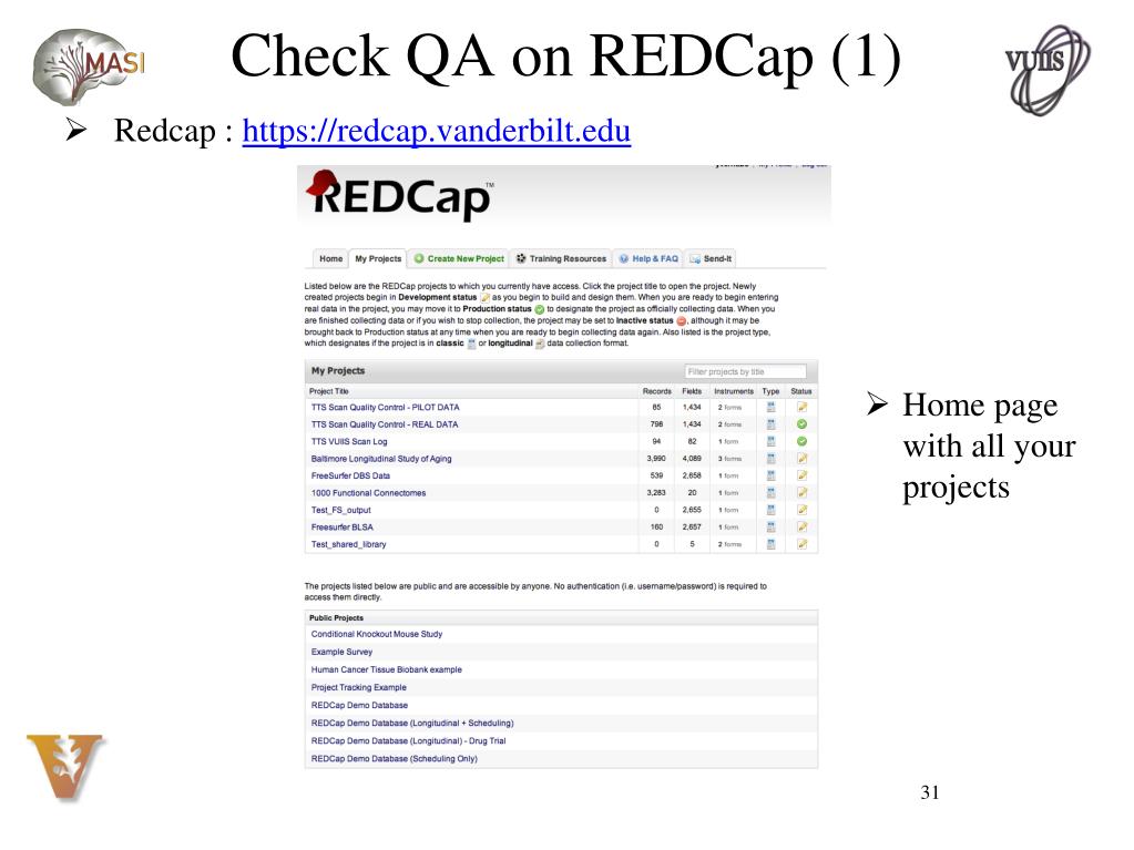 Check QA on REDCap (1) • Redcap : https://redcap.vanderbilt.edu • Home page with all your projects