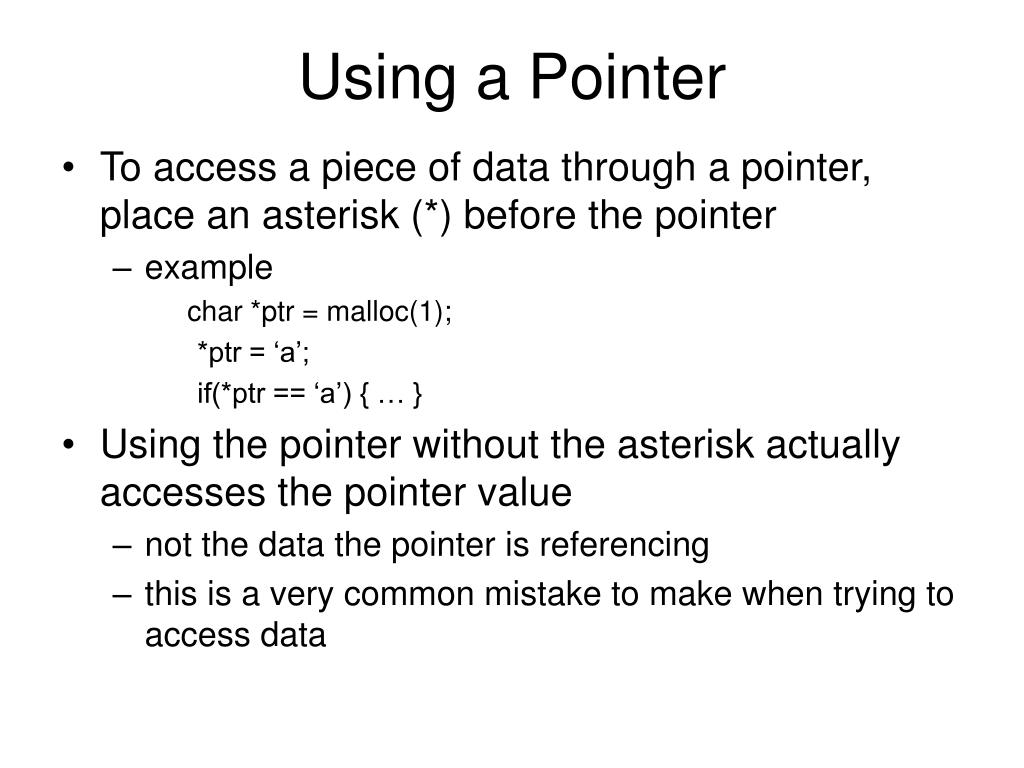 Using a Pointer • To access a piece of data through a pointer, place an asterisk (*) before the pointer • example char *ptr = malloc(1); *ptr = ‘a’; if(*ptr == ‘a’) { … } • Using the pointer without the asterisk actually accesses the pointer value • not the data the pointer is referencing • this is a very common mistake to make when trying to access data
