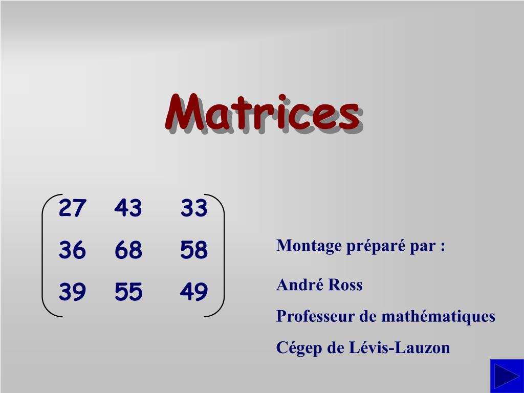 Matrices 27 36 39 43 68 55 33 58 49 Montage préparé par : André Ross Professeur de mathématiques Cégep de Lévis-Lauzon