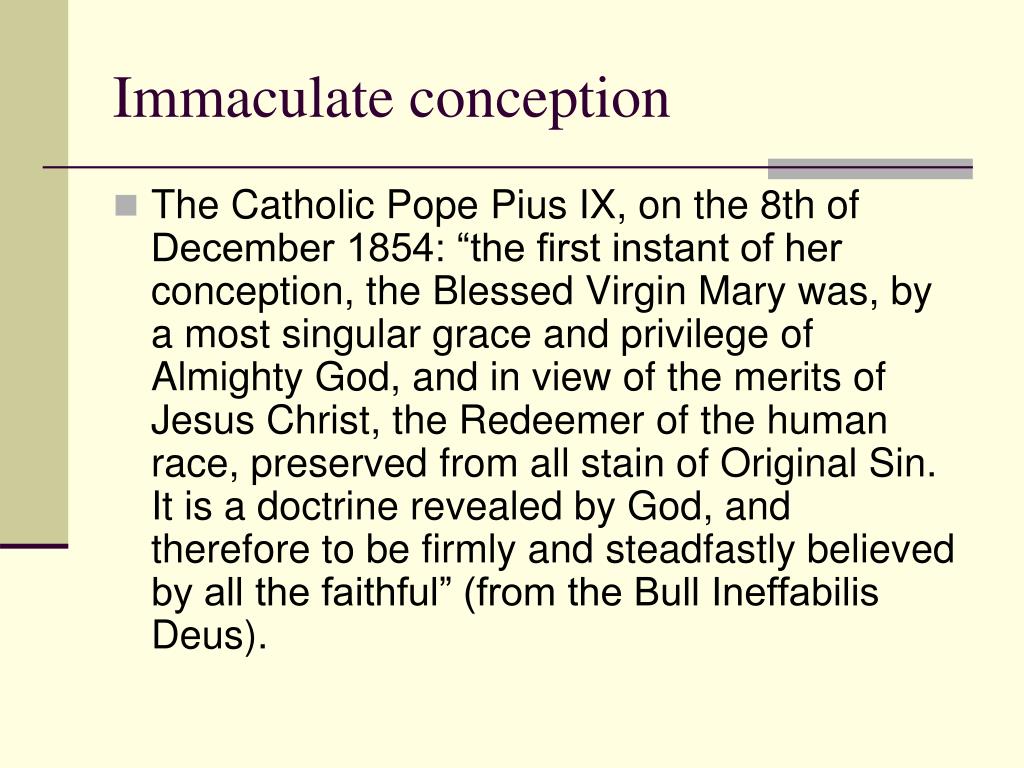 Immaculate conception • The Catholic Pope Pius IX, on the 8th of December 1854: “the first instant of her conception, the Blessed Virgin Mary was, by a most singular grace and privilege of Almighty God, and in view of the merits of Jesus Christ, the Redeemer of the human race, preserved from all stain of Original Sin. It is a doctrine revealed by God, and therefore to be firmly and steadfastly believed by all the faithful” (from the Bull Ineffabilis Deus).