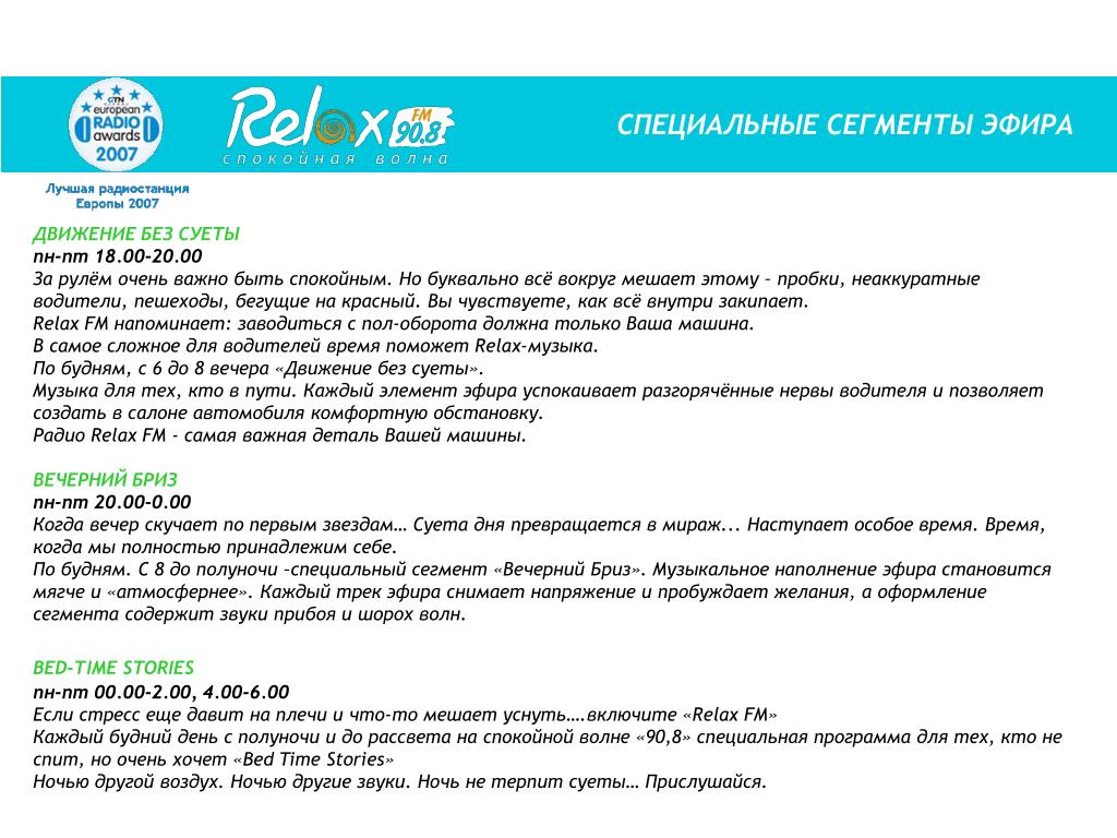 СПЕЦИАЛЬНЫЕ СЕГМЕНТЫ ЭФИРА ДВИЖЕНИЕ БЕЗ СУЕТЫ пн-пт 18.00-20.00 За рулём очень важно быть спокойным. Но буквально всё вокруг мешает этому – пробки, неаккуратные водители, пешеходы, бегущие на красный. Вы чувствуете, как всё внутри закипает. Relax FMнапоминает: заводиться с пол-оборота должна только Ваша машина. В самое сложное для водителей время поможет Relax-музыка. По будням, с 6 до 8 вечера «Движение без суеты». Музыка для тех, кто в пути.Каждый элемент эфира успокаивает разгорячённые нервы водителя и позволяет создать в салоне автомобиля комфортную обстановку. Радио Relax FM- самая важная деталь Вашей машины. ВЕЧЕРНИЙ БРИЗ пн-пт 20.00-0.00 Когда вечер скучает по первым звездам… Суета дня превращается в мираж... Наступает особое время. Время, когда мы полностью принадлежим себе. По будням. С 8 до полуночи –специальный сегмент «Вечерний Бриз». Музыкальное наполнение эфира становится мягче и «атмосфернее». Каждый трек эфира снимает напряжение и пробуждает желания, а оформление сегмента содержит звуки прибоя и шорох волн. BED-TIME STORIES пн-пт 00.00-2.00, 4.00-6.00 Если стресс еще давит на плечи и что-то мешает уснуть….включите «Relax FM» Каждый будний день с полуночи и до рассвета на спокойной волне «90,8» специальная программа для тех, кто не спит, но очень хочет «Bed Time Stories» Ночью другой воздух. Ночью другие звуки. Ночь не терпит суеты… Прислушайся.