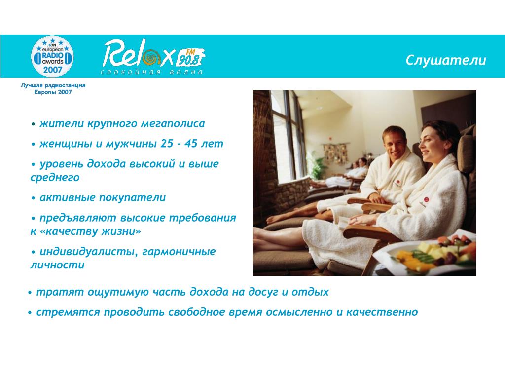 Слушатели • жители крупного мегаполиса • женщины и мужчины 25 - 45 лет • уровень дохода высокий и выше среднего • активные покупатели • предъявляют высокие требования к «качеству жизни» • индивидуалисты, гармоничные личности • тратят ощутимую часть дохода на досуг и отдых • стремятся проводить свободное время осмысленно и качественно