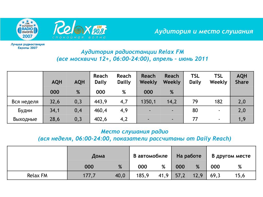 Аудитория и место слушания Аудитория радиостанции Relax FM (все москвичи 12+, 06:00-24:00), апрель – июнь 2011 Место слушания радио (вся неделя, 06:00-24:00, показатели рассчитаны от Daily Reach)