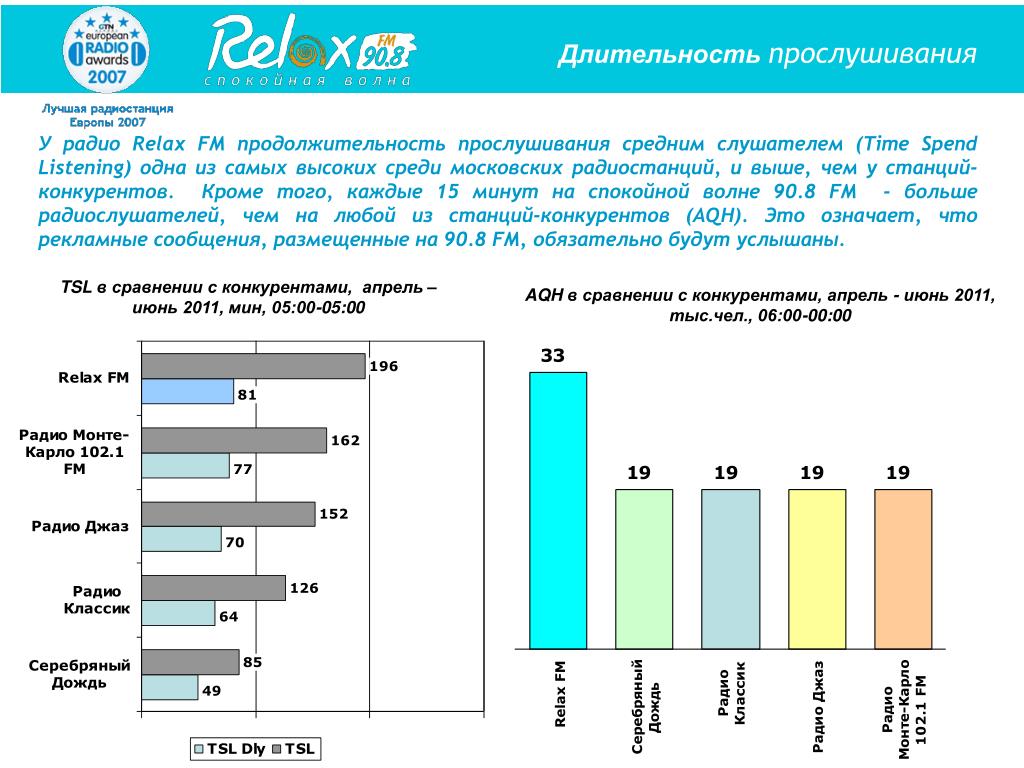 Длительностьпрослушивания У радио Relax FM продолжительность прослушивания средним слушателем (Time Spend Listening) одна из самых высоких среди московских радиостанций, и выше, чем у станций-конкурентов. Кроме того, каждые 15 минут на спокойной волне 90.8 FM - больше радиослушателей, чем на любой из станций-конкурентов (AQH). Это означает, что рекламные сообщения, размещенные на 90.8 FM, обязательно будут услышаны. TSL в сравнении с конкурентами, апрель – июнь 2011, мин, 05:00-05:00 AQH в сравнении с конкурентами, апрель - июнь 2011, тыс.чел., 06:00-00:00