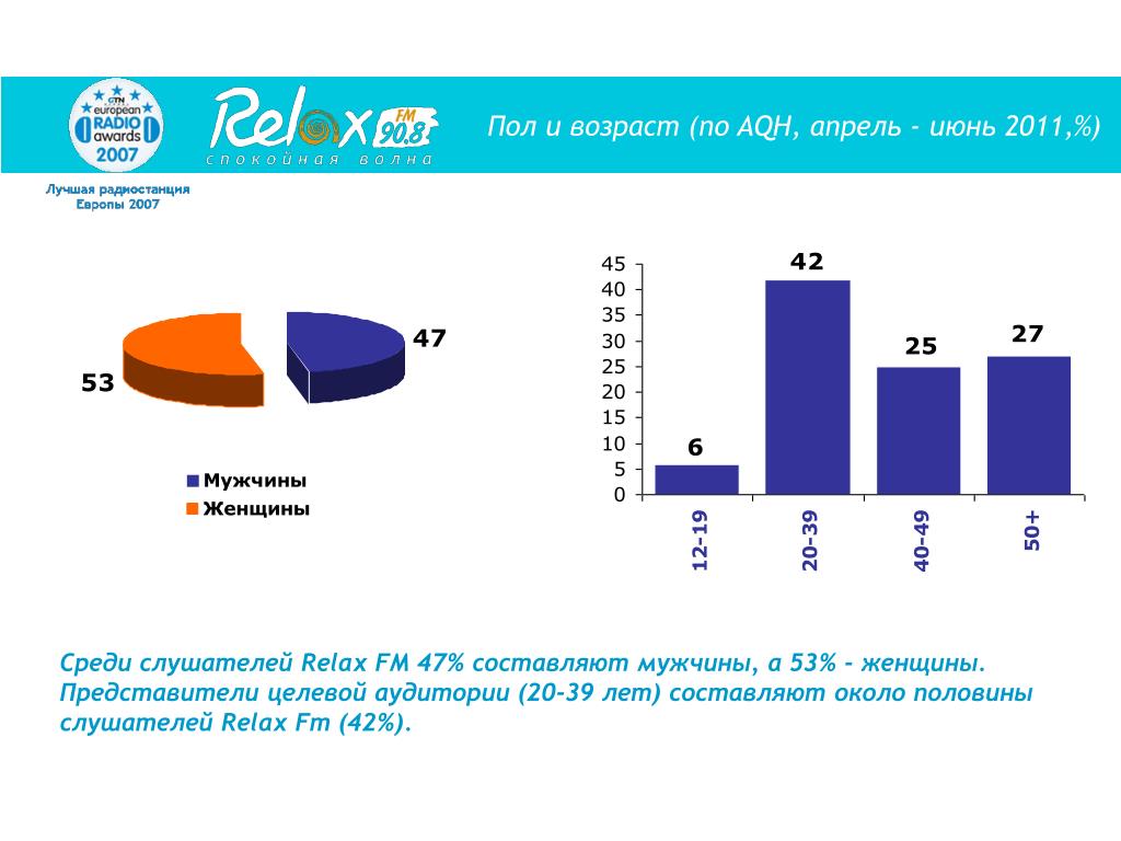 Пол и возраст (по AQH, апрель - июнь 2011,%) Среди слушателей Relax FM 47% составляют мужчины, а 53% - женщины. Представители целевой аудитории (20-39 лет) составляют около половины слушателей Relax Fm (42%).