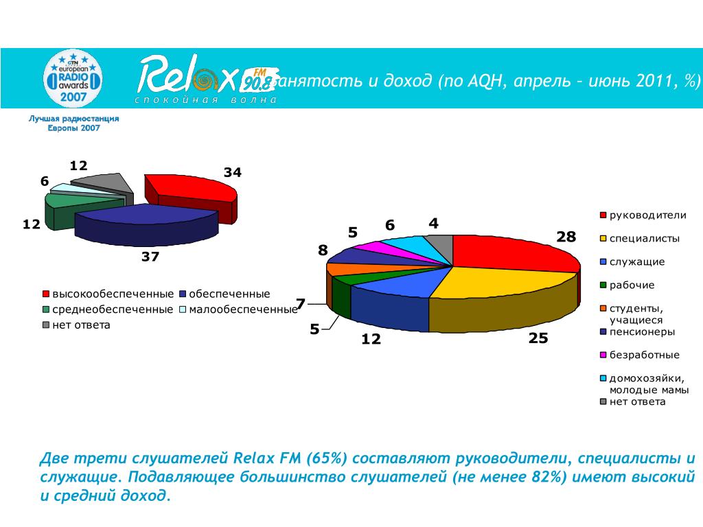 Занятость и доход (по AQH, апрель – июнь 2011, %) Две трети слушателей Relax FM (65%) составляют руководители, специалисты и служащие. Подавляющее большинство слушателей (не менее 82%) имеют высокий и средний доход.