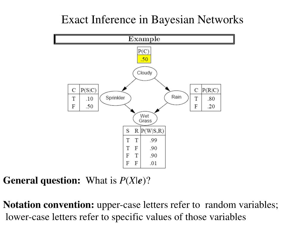 The famous “sprinkler” example (J. Pearl, Probabilistic Reasoning in Intelligent Systems, 1988). Recall rule for inference in Bayesian networks: Example: What is A (slightly) harder question: What is P ( C | W , R )? . Exact Inference in Bayesian Networks.
