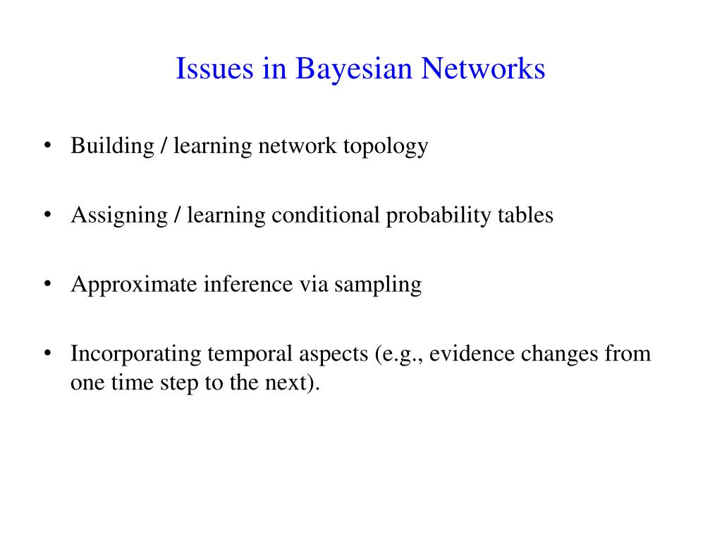 Issues in Bayesian Networks • Building / learning network topology • Assigning / learning conditional probability tables • Approximate inference via sampling • Incorporating temporal aspects (e.g., evidence changes from one time step to the next).