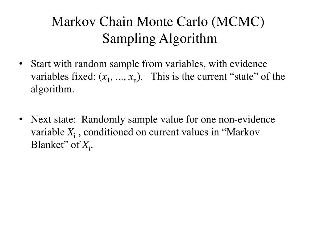 Markov Chain Monte Carlo (MCMC) Sampling Algorithm • Start with random sample from variables, with evidence variables fixed: (x1, ..., xn). This is the current “state” of the algorithm. • Next state: Randomly sample value for one non-evidence variable Xi , conditioned on current values in “Markov Blanket” of Xi.