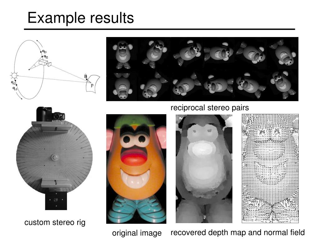 Example results reciprocal stereo pairs custom stereo rig recovered depth map and normal field original image