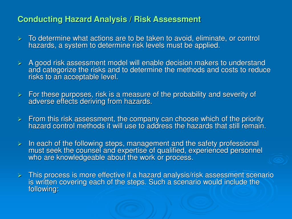 Conducting Hazard Analysis / Risk Assessment • To determine what actions are to be taken to avoid, eliminate, or control hazards, a system to determine risk levels must be applied. • A good risk assessment model will enable decision makers to understand and categorize the risks and to determine the methods and costs to reduce risks to an acceptable level. • For these purposes, risk is a measure of the probability and severity of adverse effects deriving from hazards. • From this risk assessment, the company can choose which of the priority hazard control methods it will use to address the hazards that still remain. • In each of the following steps, management and the safety professional must seek the counsel and expertise of qualified, experienced personnel who are knowledgeable about the work or process. • This process is more effective if a hazard analysis/risk assessment scenario is written covering each of the steps. Such a scenario would include the following: