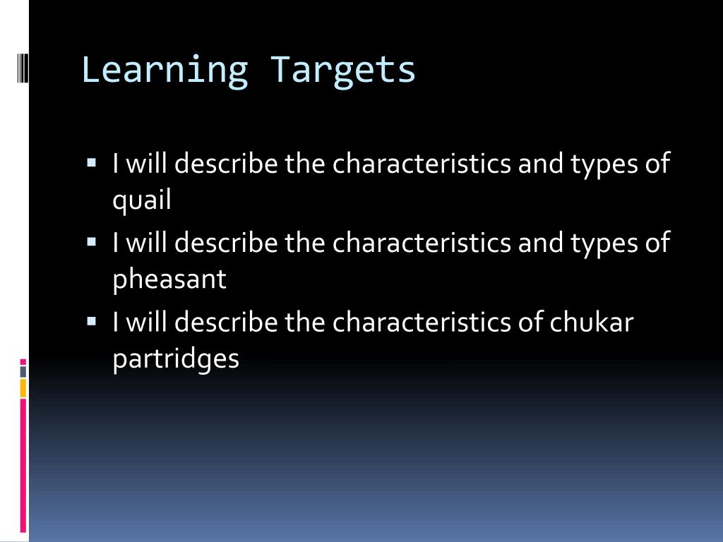 Learning Targets • I will describe the characteristics and types of quail • I will describe the characteristics and types of pheasant • I will describe the characteristics of chukar partridges