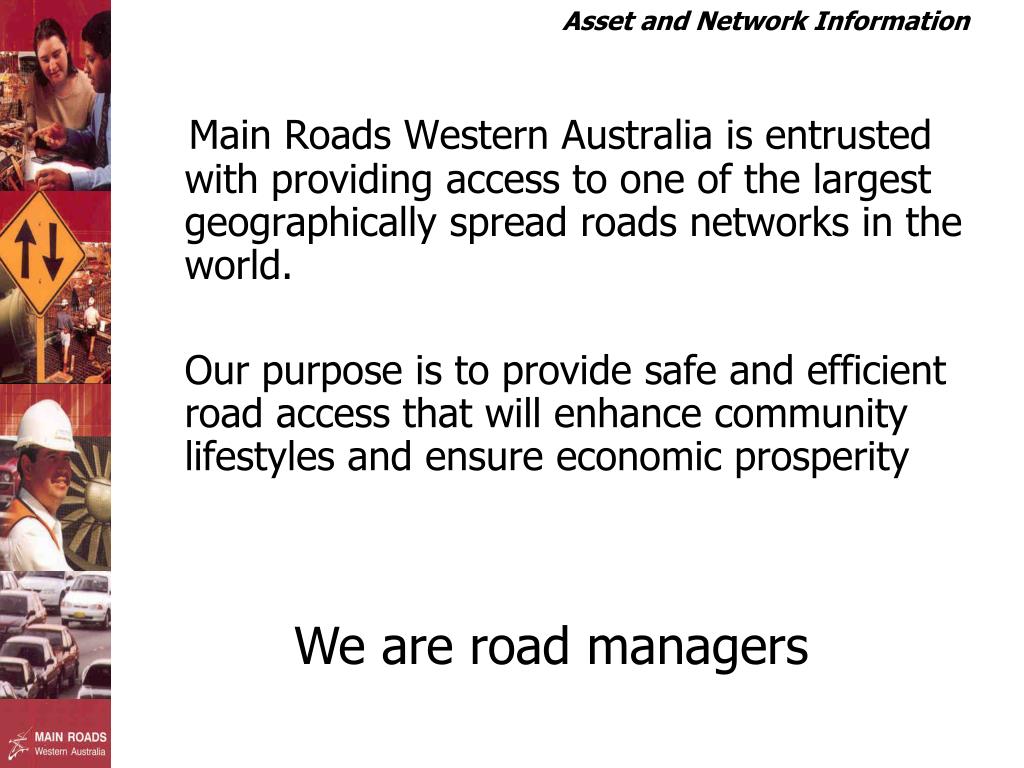 Main Roads Western Australia is entrusted with providing access to one of the largest geographically spread roads networks in the world. Our purpose is to provide safe and efficient road access that will enhance community lifestyles and ensure economic prosperity We are road managers