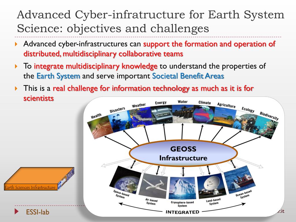 AdvancedCyber-infratructureforEarth System Science: objectives and challenges • Advanced cyber-infrastructures can support the formation and operation of distributed, multidisciplinary collaborative teams • To integrate multidisciplinary knowledge to understand the properties of the Earth System and serve important Societal Benefit Areas • This is a real challenge for information technologyas much as it is for scientists GEOSS Infrastructure Earth Sciences Infrastructure