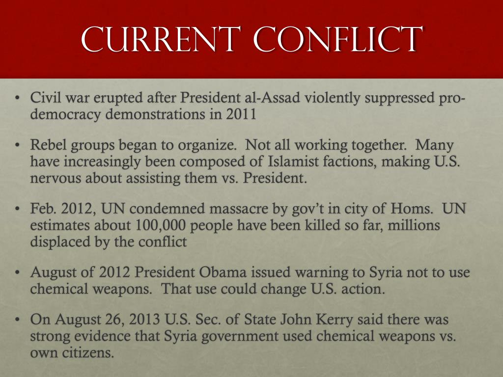 Current conflict • Civil war erupted after President al-Assad violently suppressed pro-democracy demonstrations in 2011 • Rebel groups began to organize. Not all working together. Many have increasingly been composed of Islamist factions, making U.S. nervous about assisting them vs. President. • Feb. 2012, UN condemned massacre by gov’t in city of Homs. UN estimates about 100,000 people have been killed so far, millions displaced by the conflict • August of 2012 President Obama issued warning to Syria not to use chemical weapons. That use could change U.S. action. • On August 26, 2013 U.S. Sec. of State John Kerry said there was strong evidence that Syria government used chemical weapons vs. own citizens.