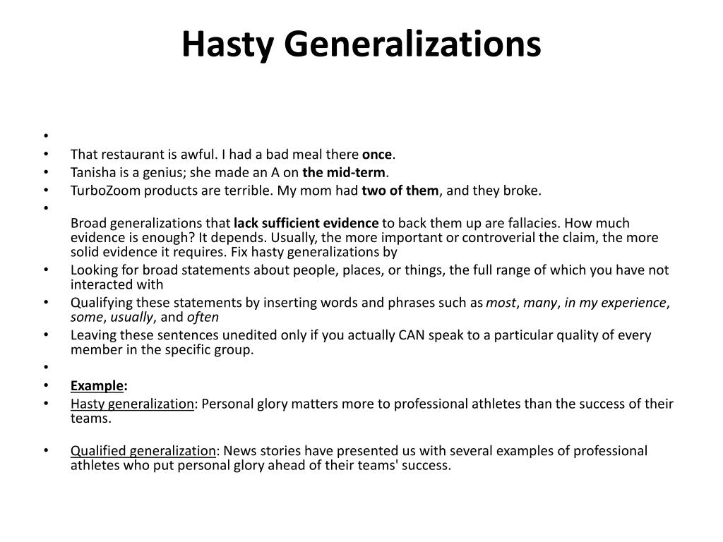 Hasty Generalizations • That restaurant is awful. I had a bad meal there once. • Tanisha is a genius; she made an A on the mid-term. • TurboZoom products are terrible. My mom had two of them, and they broke. • Broad generalizations that lack sufficient evidence to back them up are fallacies. How much evidence is enough? It depends. Usually, the more important or controverial the claim, the more solid evidence it requires. Fix hasty generalizations by • Looking for broad statements about people, places, or things, the full range of which you have not interacted with • Qualifying these statements by inserting words and phrases such as most, many, in my experience, some, usually, and often • Leaving these sentences unedited only if you actually CAN speak to a particular quality of every member in the specific group. • Example: • Hasty generalization: Personal glory matters more to professional athletes than the success of their teams. • Qualified generalization: News stories have presented us with several examples of professional athletes who put personal glory ahead of their teams' success.