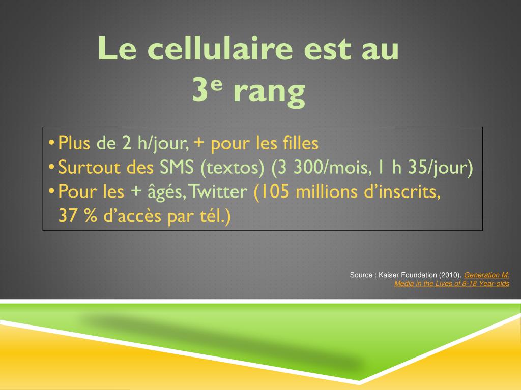 Le cellulaire est au 3e rang • Plus de 2 h/jour, + pour les filles • Surtout des SMS (textos) (3 300/mois, 1 h 35/jour) • Pour les + âgés, Twitter (105 millions d’inscrits, 37 % d’accès par tél.) Source : Kaiser Foundation (2010). Generation M: Media in the Lives of 8-18 Year-olds