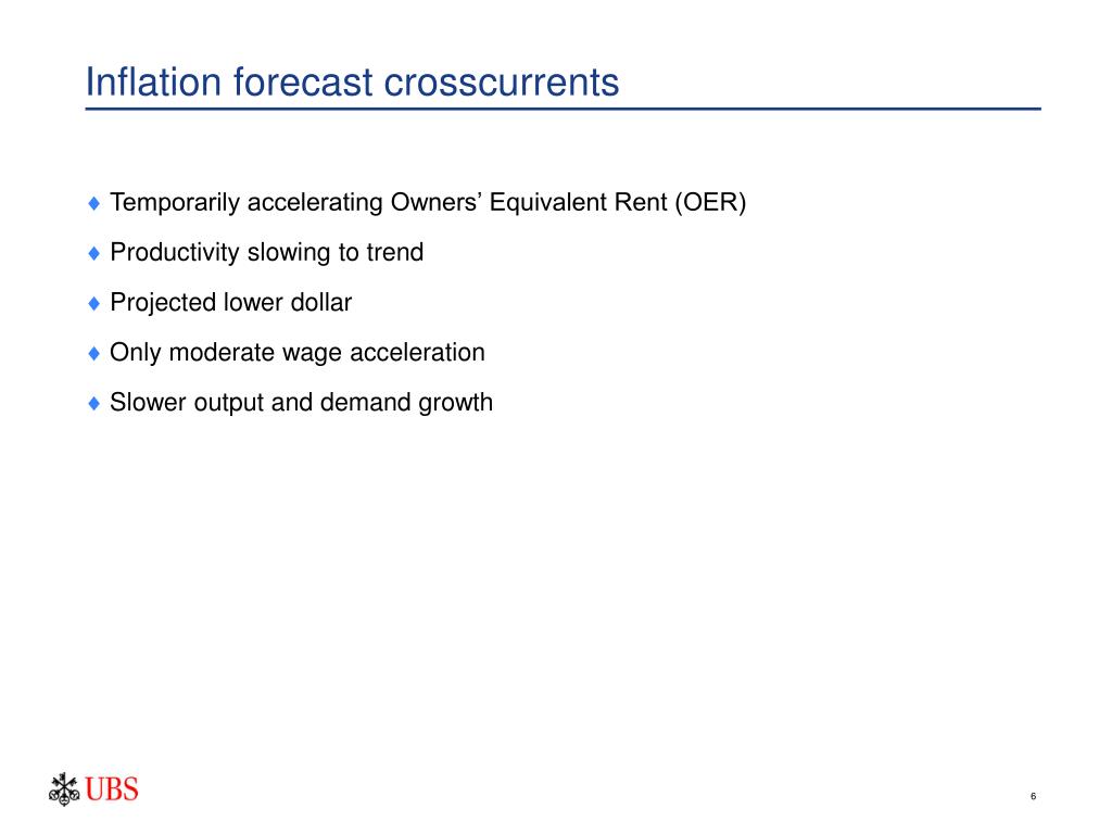 Inflation forecast crosscurrents • Temporarily accelerating Owners’ Equivalent Rent (OER) • Productivity slowing to trend • Projected lower dollar • Only moderate wage acceleration • Slower output and demand growth