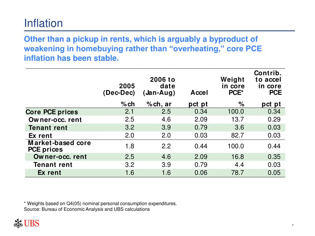 Inflation Other than a pickup in rents, which is arguably a byproduct of weakening in homebuying rather than “overheating,” core PCE inflation has been stable. * Weights based on Q4(05) nominal personal consumption expenditures. Source: Bureau of Economic Analysis and UBS calculations