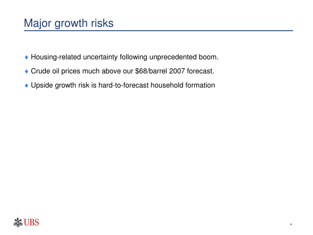 Major growth risks • Housing-related uncertainty following unprecedented boom. • Crude oil prices much above our $68/barrel 2007 forecast. • Upside growth risk is hard-to-forecast household formation