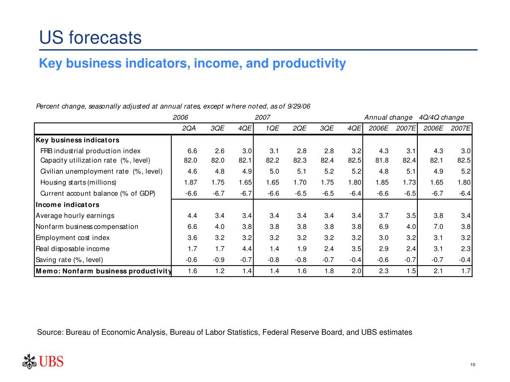 US forecasts Key business indicators, income, and productivity Source: Bureau of Economic Analysis, Bureau of Labor Statistics, Federal Reserve Board, and UBS estimates