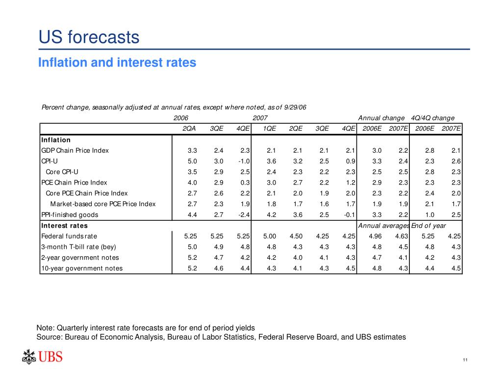 US forecasts Inflation and interest rates Note: Quarterly interest rate forecasts are for end of period yields Source: Bureau of Economic Analysis, Bureau of Labor Statistics, Federal Reserve Board, and UBS estimates