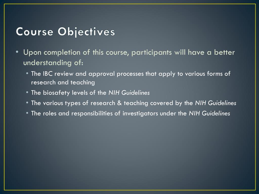 Course Objectives • Upon completion of this course, participants will have a better understanding of: • The IBC review and approval processes that apply to various forms of research and teaching • The biosafety levels of the NIH Guidelines • The various types of research & teaching covered by the NIH Guidelines • The roles and responsibilities of investigators under the NIH Guidelines
