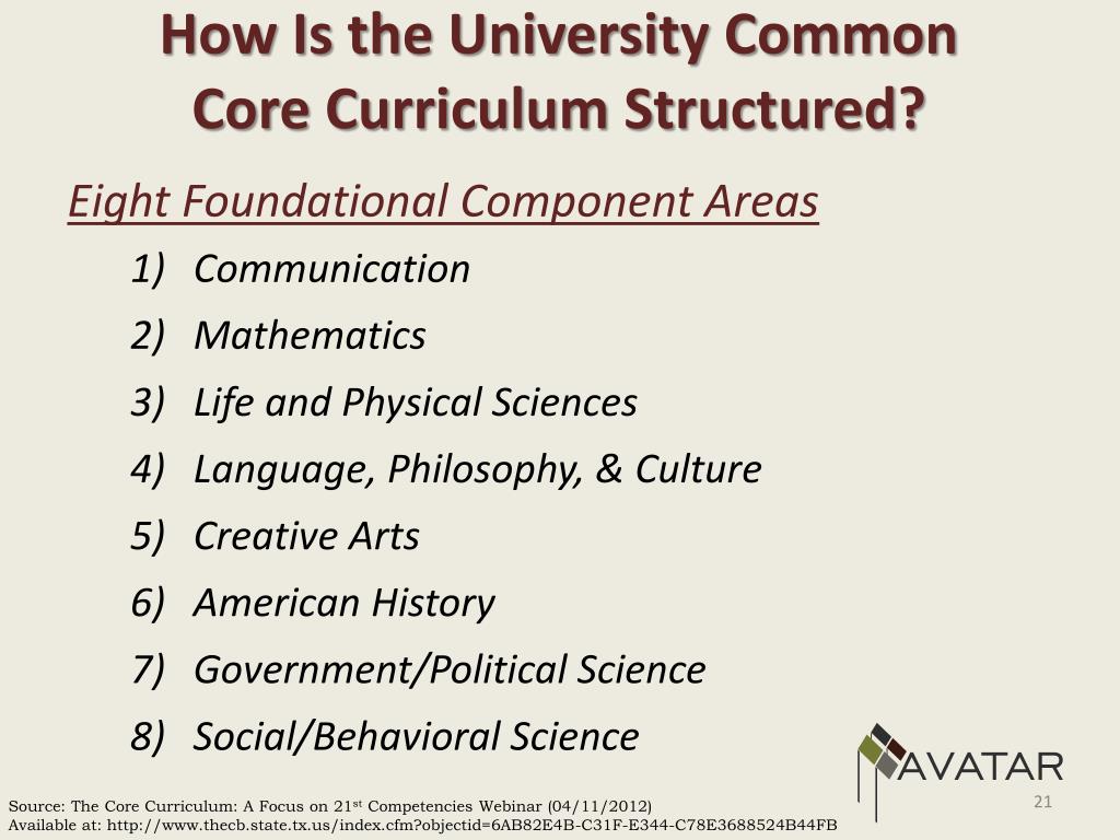 How Is the University Common Core Curriculum Structured? Eight Foundational Component Areas • Communication • Mathematics • Life and Physical Sciences • Language, Philosophy, & Culture • Creative Arts • American History • Government/Political Science • Social/Behavioral Science Source: The Core Curriculum: A Focus on 21st Competencies Webinar (04/11/2012) Available at: http://www.thecb.state.tx.us/index.cfm?objectid=6AB82E4B-C31F-E344-C78E3688524B44FB