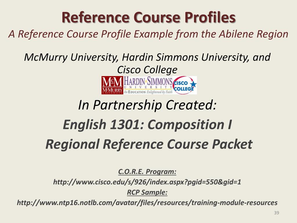 Reference Course ProfilesA Reference Course Profile Example from the Abilene Region McMurry University, Hardin Simmons University, and Cisco College Partnership In Partnership Created: English 1301: Composition I Regional Reference Course Packet C.O.R.E. Program: http://www.cisco.edu/s/926/index.aspx?pgid=550&gid=1 RCP Sample: http://www.ntp16.notlb.com/avatar/files/resources/training-module-resources dfsdfsdfsdfsdfsdfsdfsdfsdfsdfsdfsdfsdfsdfsdfsdfsdfsdfsdfsdfs