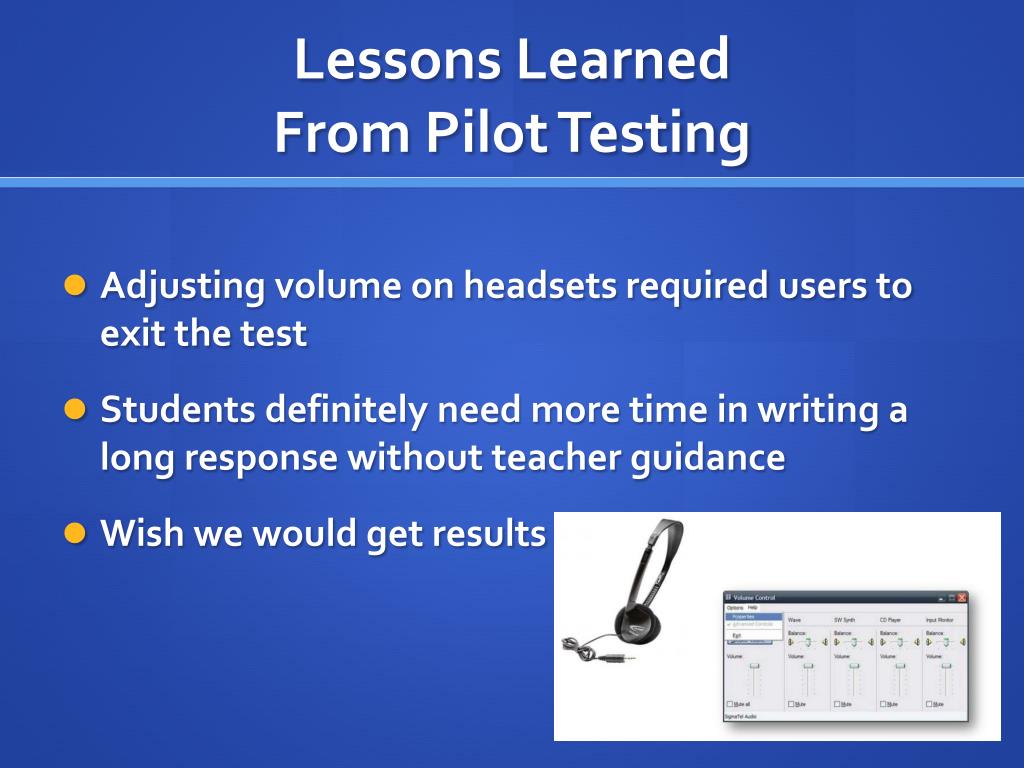 Lessons Learned From Pilot Testing • Adjusting volume on headsets required users to exit the test • Students definitely need more time in writing a long response without teacher guidance • Wish we would get results