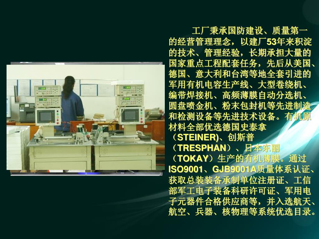 工厂秉承国防建设、质量第一的经营管理理念,以建厂53年来积淀的技术、管理经验,长期承担大量的国家重点工程配套任务,先后从美国、德国、意大利和台湾等地全套引进的军用有机电容生产线、大型卷绕机、编带焊接机、高频薄膜自动分选机、圆盘喷金机、粉末包封机等先进制造和检测设备等先进技术设备。有机原材料全部优选德国史泰拿(STEINER)、创斯普(TRESPHAN)、日本东丽(TOKAY)生产的有机薄膜。通过ISO9001、GJB9001A质量体系认证、获取总装装备承制单位注册证、工信部军工电子装备科研许可证、军用电子元器件合格供应商等,并入选航天、航空、兵器、核物理等系统优选目录。工厂秉承国防建设、质量第一的经营管理理念,以建厂53年来积淀的技术、管理经验,长期承担大量的国家重点工程配套任务,先后从美国、德国、意大利和台湾等地全套引进的军用有机电容生产线、大型卷绕机、编带焊接机、高频薄膜自动分选机、圆盘喷金机、粉末包封机等先进制造和检测设备等先进技术设备。有机原材料全部优选德国史泰拿(STEINER)、创斯普(TRESPHAN)、日本东丽(TOKAY)生产的有机薄膜。通过ISO9001、GJB9001A质量体系认证、获取总装装备承制单位注册证、工信部军工电子装备科研许可证、军用电子元器件合格供应商等,并入选航天、航空、兵器、核物理等系统优选目录。