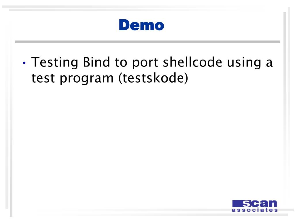 Demo • Building a shellcode (bind.asm) • Writing • Compiling • Hex editing
