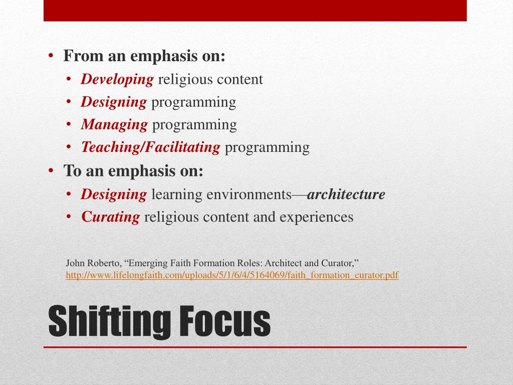From an emphasis on: • Developing religiouscontent • Designingprogramming • Managingprogramming • Teaching/Facilitatingprogramming • To anemphasison: • Designinglearningenvironments—architecture • Curatingreligiouscontentandexperiences John Roberto, “Emerging Faith Formation Roles: Architect and Curator,” http://www.lifelongfaith.com/uploads/5/1/6/4/5164069/faith_formation_curator.pdf Shifting Focus