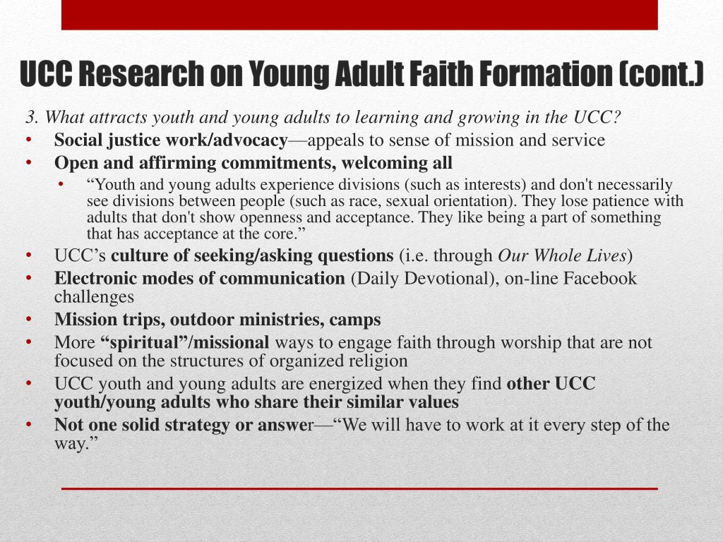 UCC Research on Young Adult Faith Formation (cont.) 2. How are youth and young adults experiencing community? Acts as a support system or alternative family Intergenerational, multicultural, open and affirming Experienced both in face-to-face interactions and through social networking (Facebook, Twitter, Linked In, etc.) Therefore, community is not just “those you are with” and is understood and practiced in a broader sense. “Youth and young adults are having difficulty forming community. Their time is often very scheduled which does not allow for the organic development of youth centered community. Those skills are developed when youth and young adults have sustained ‘free time’ with peers and intergenerational feedback.”