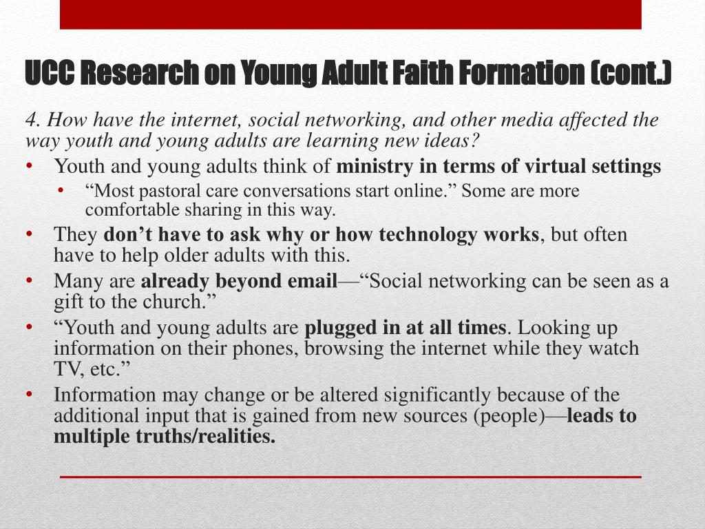 UCC Research on Young Adult Faith Formation (cont.) 4. How have the internet, social networking, and other media affected the way youth and young adults are learning new ideas? • Youth and young adults think of ministry in terms of virtual settings • “Most pastoral care conversations start online.” Some are more comfortable sharing in this way. • They don’t have to ask why or how technology works, but often have to help older adults with this. • Many are already beyond email—“Social networking can be seen as a gift to the church.” • “Youth and young adults are plugged in at all times. Looking up information on their phones, browsing the internet while they watch TV, etc.” • Information may change or be altered significantly because of the additional input that is gained from new sources (people)—leads to multiple truths/realities.