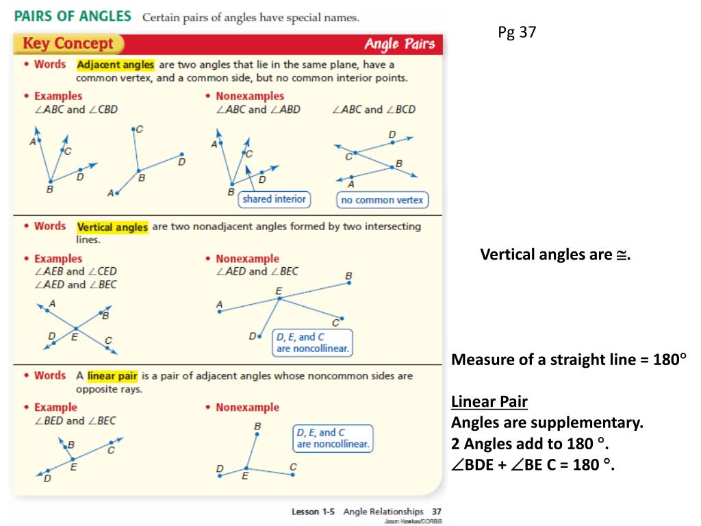 Pg 37 Vertical angles are . Measure of a straight line = 180 Linear Pair Angles are supplementary. 2 Angles add to 180 . BDE + BE C = 180 .