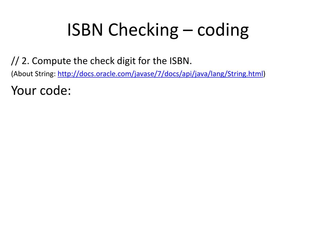 ISBN Checking – coding // 2. Compute the check digit for the ISBN. (About String: http://docs.oracle.com/javase/7/docs/api/java/lang/String.html) Your code: