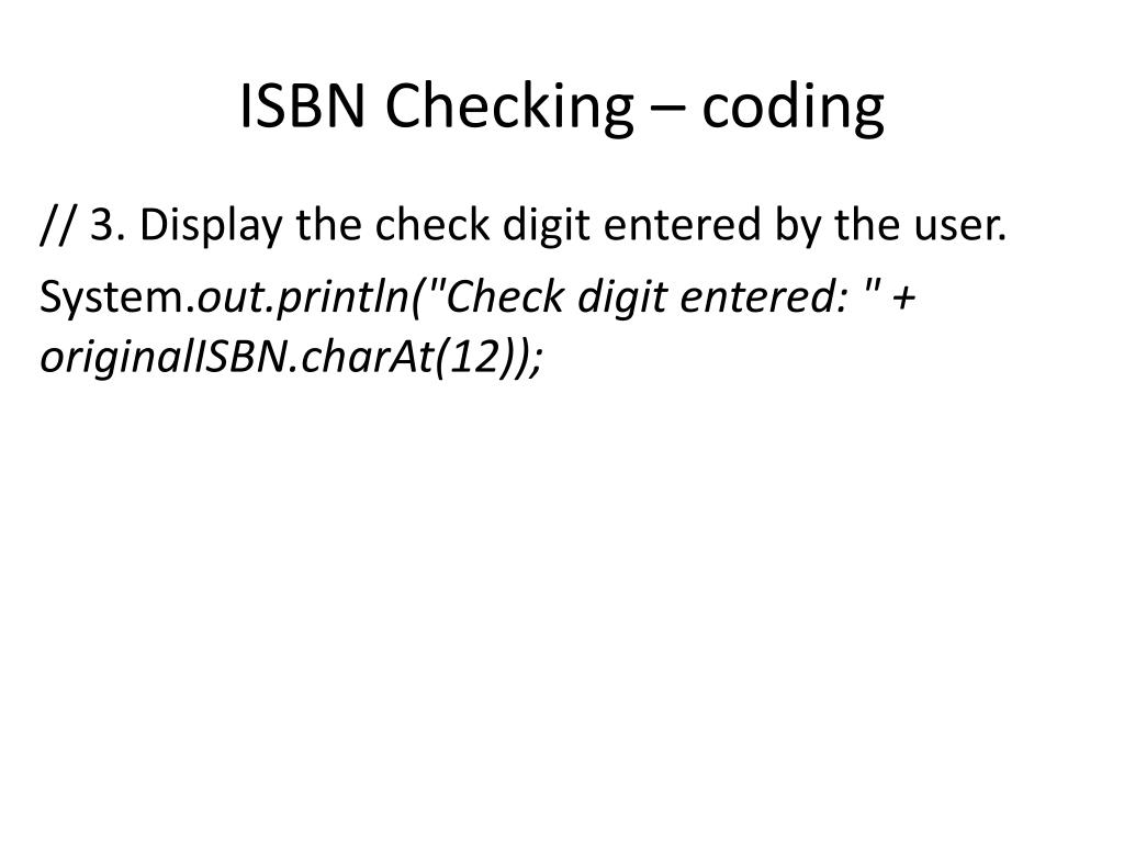 ISBN Checking – coding // 3. Display the check digit entered by the user. System.out.println("Check digit entered: " + originalISBN.charAt(12));