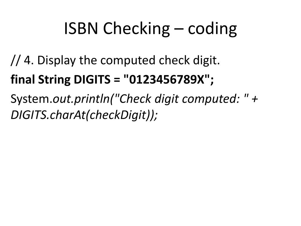 ISBN Checking – coding // 4. Display the computed check digit. final String DIGITS = "0123456789X"; System.out.println("Check digit computed: " + DIGITS.charAt(checkDigit));