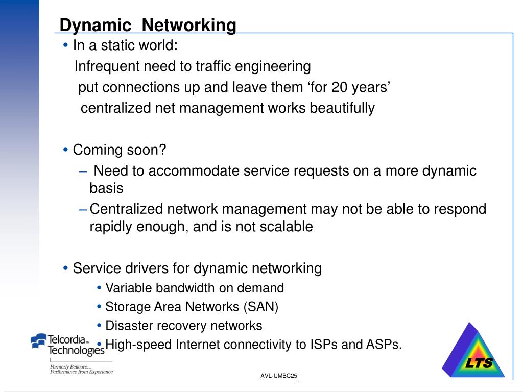 Dynamic Networking • In a static world: Infrequent need to traffic engineering put connections up and leave them ‘for 20 years’ centralized net management works beautifully • Coming soon? • Need to accommodate service requests on a more dynamic basis • Centralized network management may not be able to respond rapidly enough, and is not scalable • Service drivers for dynamic networking • Variable bandwidth on demand • Storage Area Networks (SAN) • Disaster recovery networks • High-speed Internet connectivity to ISPs and ASPs.