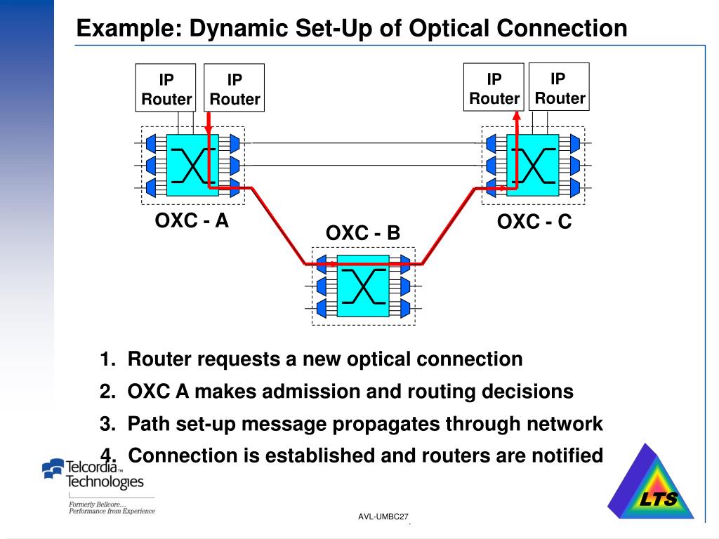 IP Router IP Router IP Router IP Router 1. Router requests a new optical connection 3. Path set-up message propagates through network 4. Connection is established and routers are notified Example: Dynamic Set-Up of Optical Connection OXC - A OXC - C OXC - B 2. OXC A makes admission and routing decisions