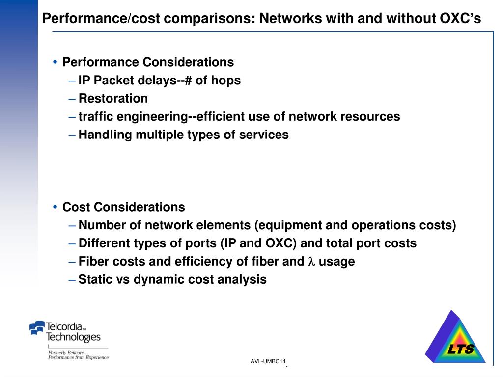 Performance/cost comparisons: Networks with and without OXC’s • Performance Considerations • IP Packet delays--# of hops • Restoration • traffic engineering--efficient use of network resources • Handling multiple types of services • Cost Considerations • Number of network elements (equipment and operations costs) • Different types of ports (IP and OXC) and total port costs • Fiber costs and efficiency of fiber and usage • Static vs dynamic cost analysis